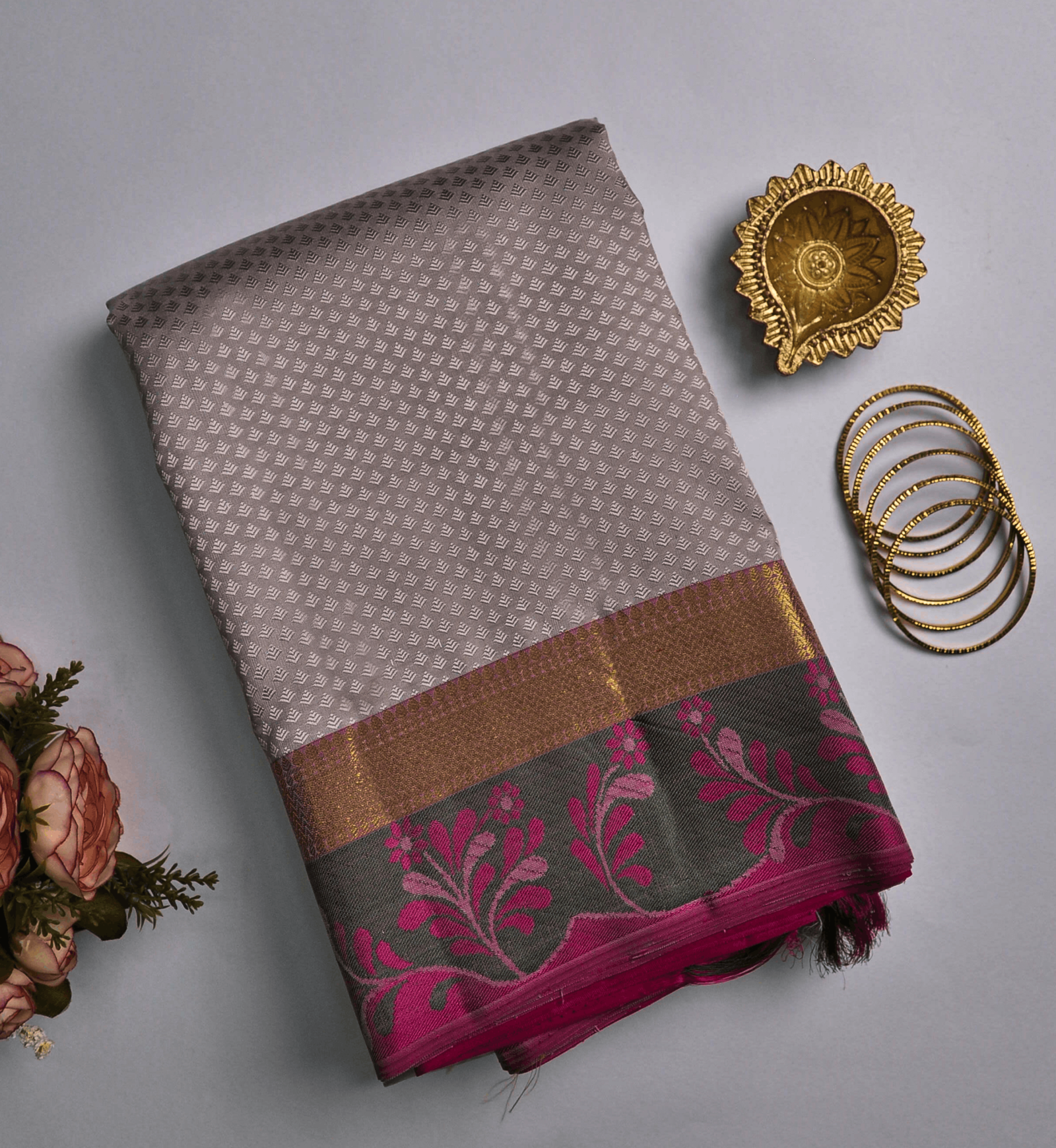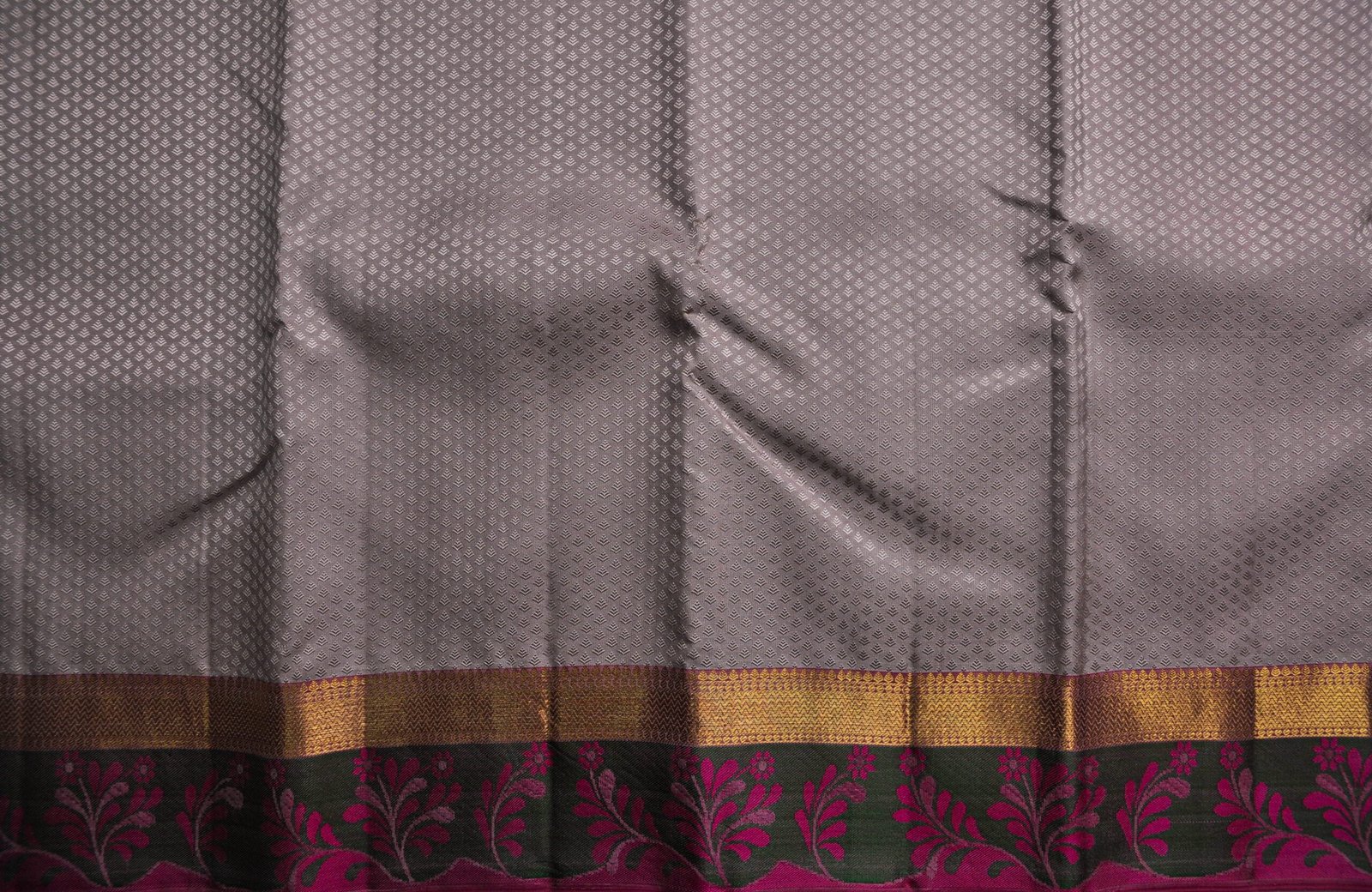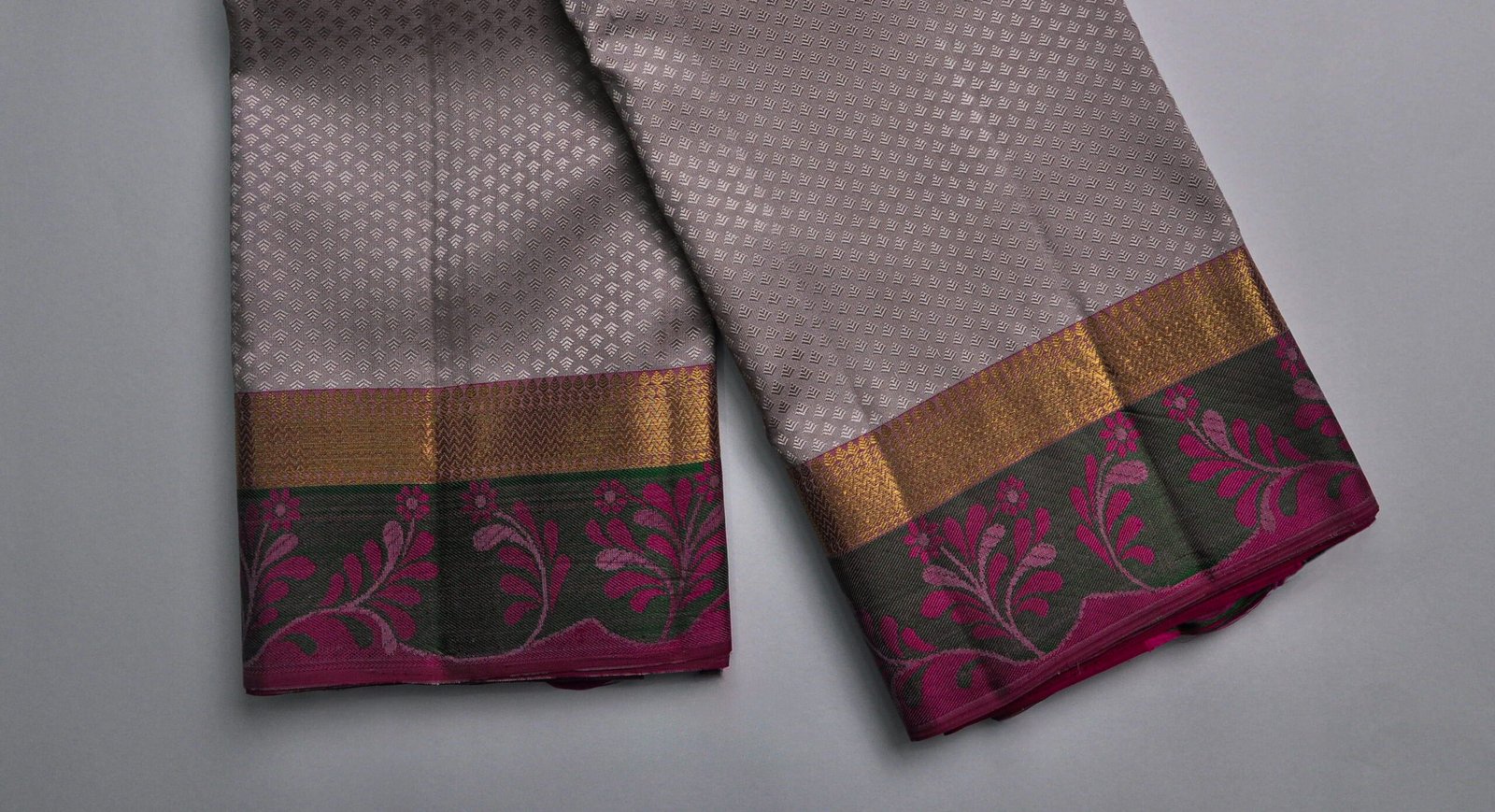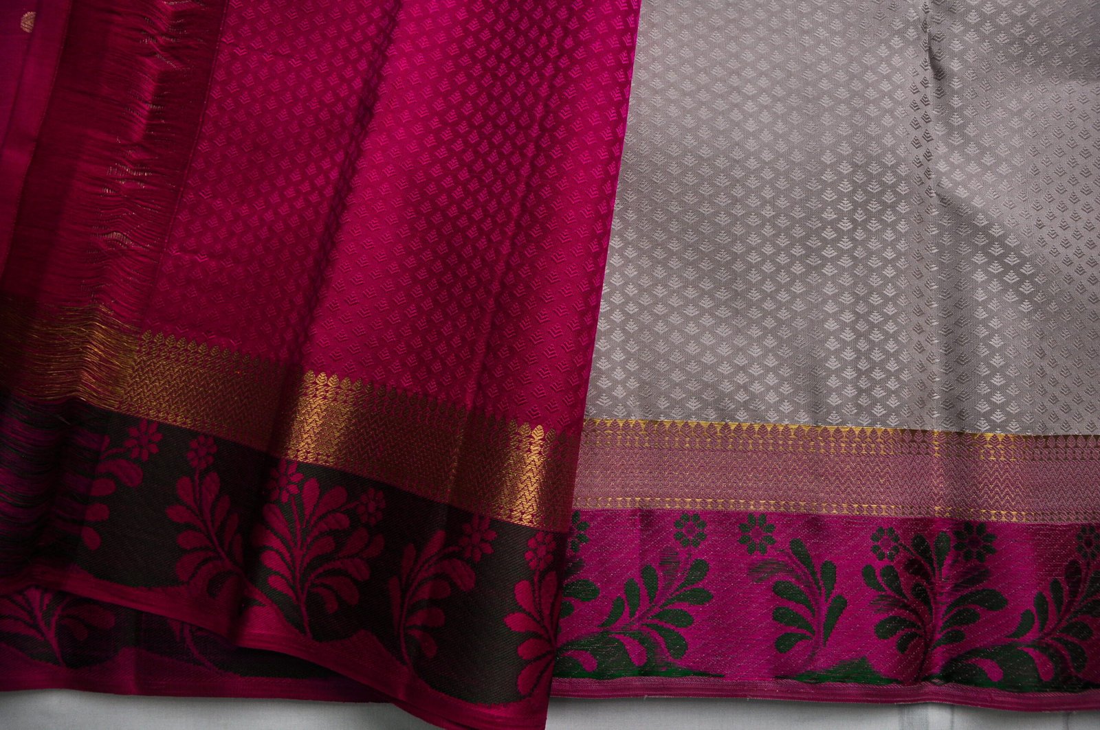 A D/S Kanchipuram silk saree in grey and half-white with zari self-pallu, intricate silk thread work across the body and a vibrant pink blouse.