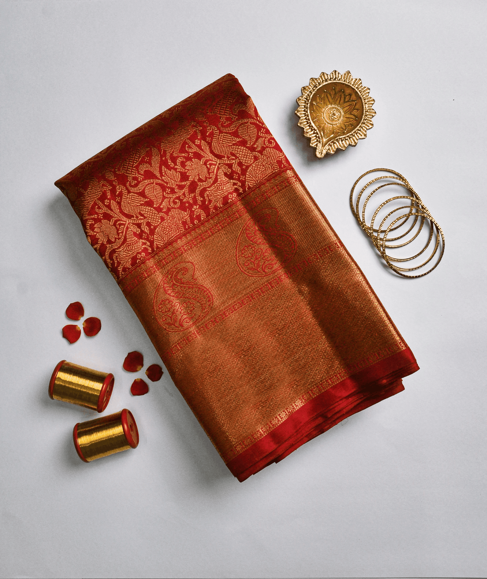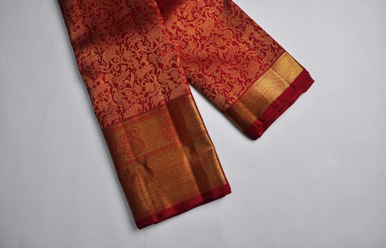 Dry clean only to preserve silk lustre and zari brilliance. Store in a breathable muslin or cotton cloth to prevent moisture damage. Avoid prolonged exposure to direct sunlight to retain colour vibrancy. Do not fold along zari lines; roll gently to prevent creasing.