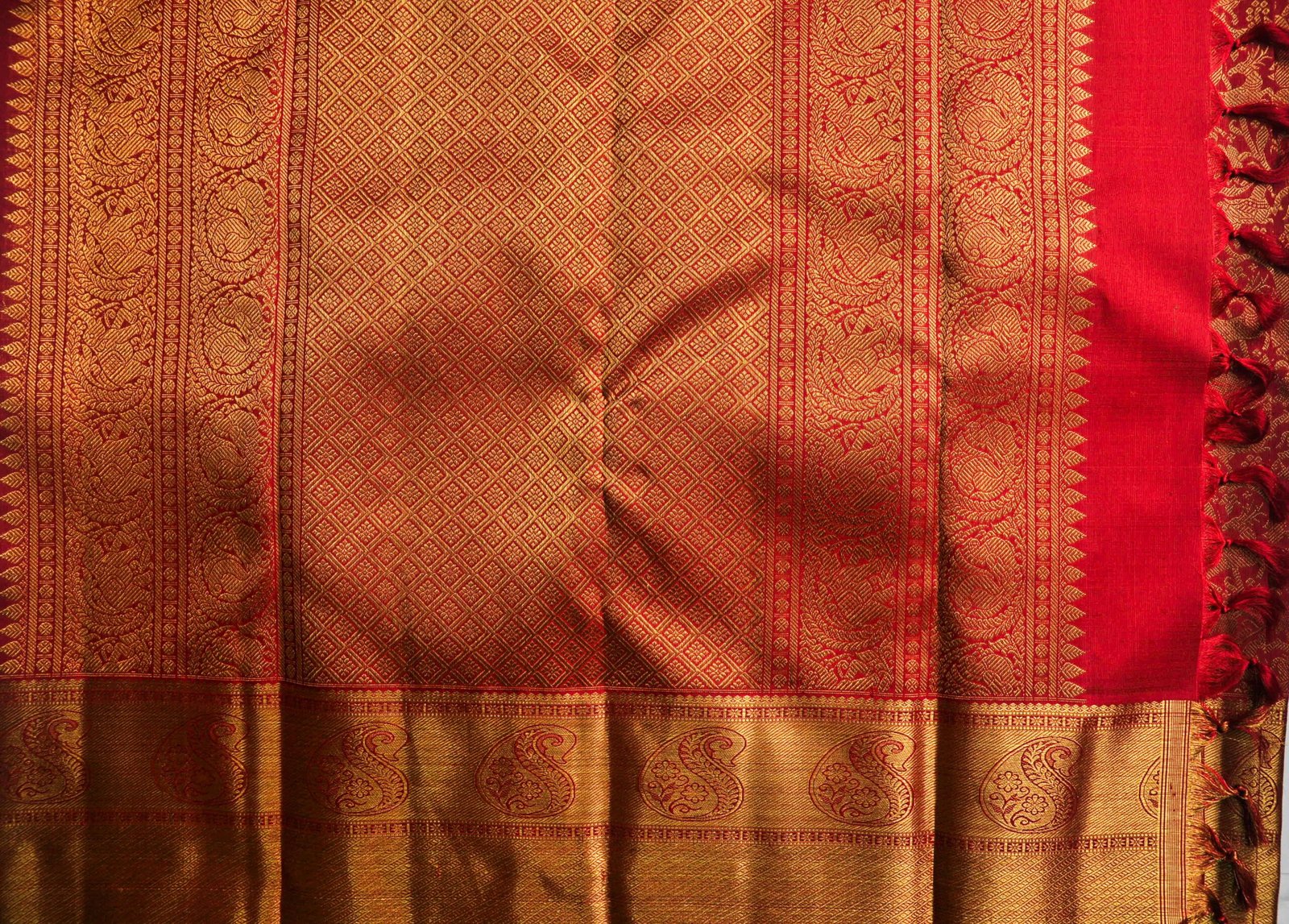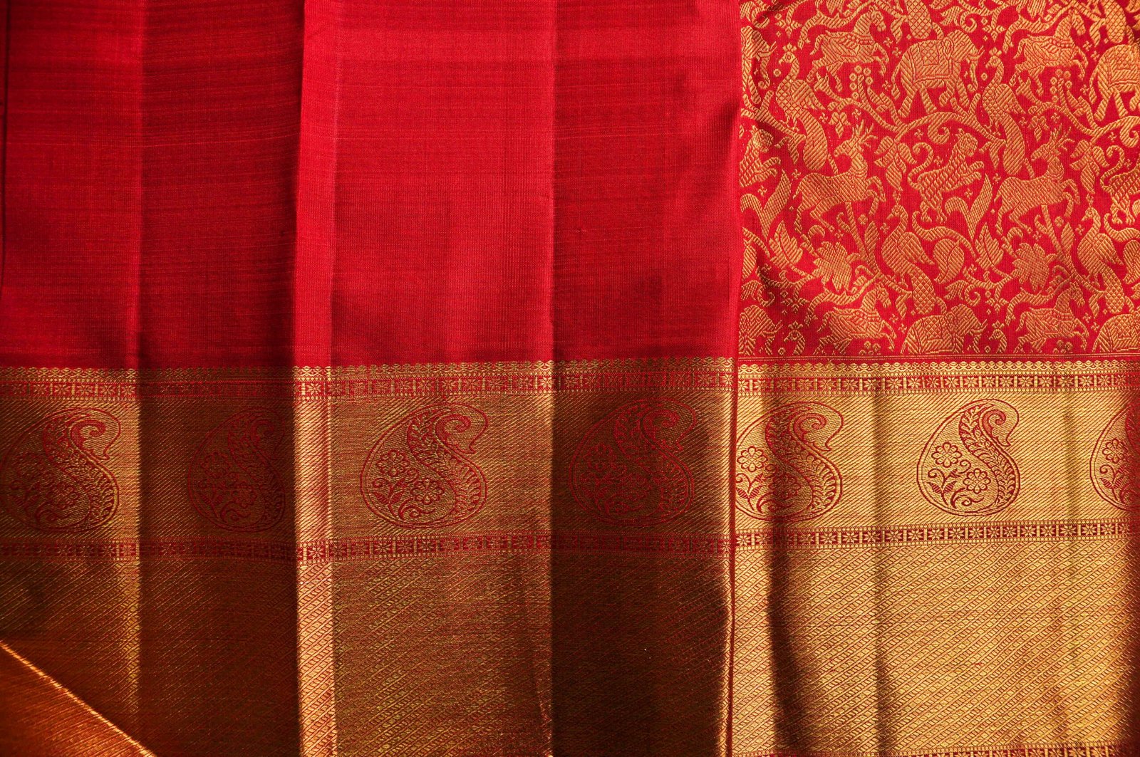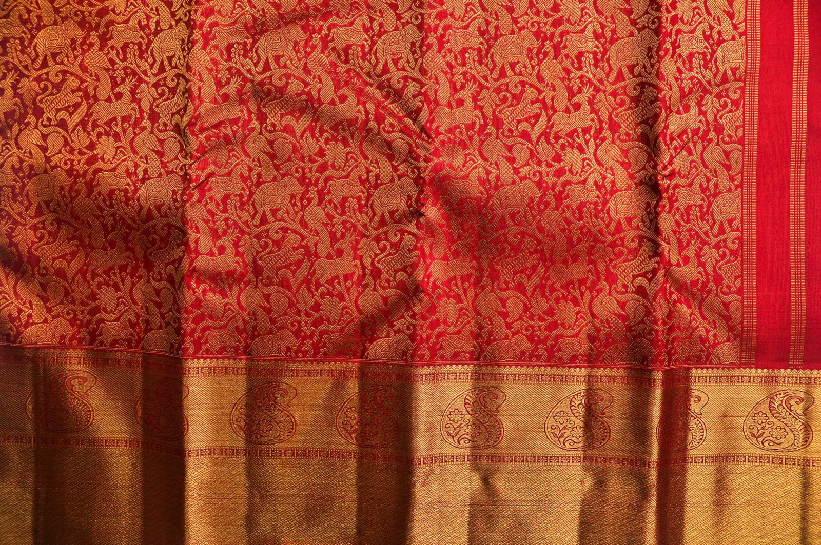Half-and-half sarees require the loom to be threaded with two different colour warps simultaneously — an advanced technique that demands careful planning of the entire weave structure before a single throw of the shuttle. The Rising Pattern adds another layer of complexity as the weaver must increase the motif scale across the repeat.