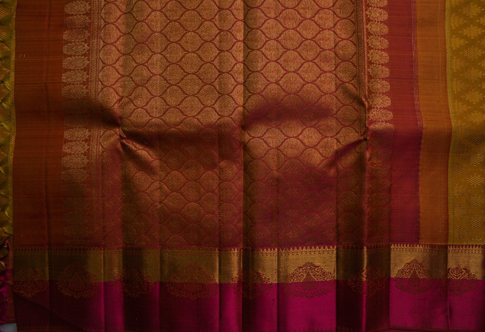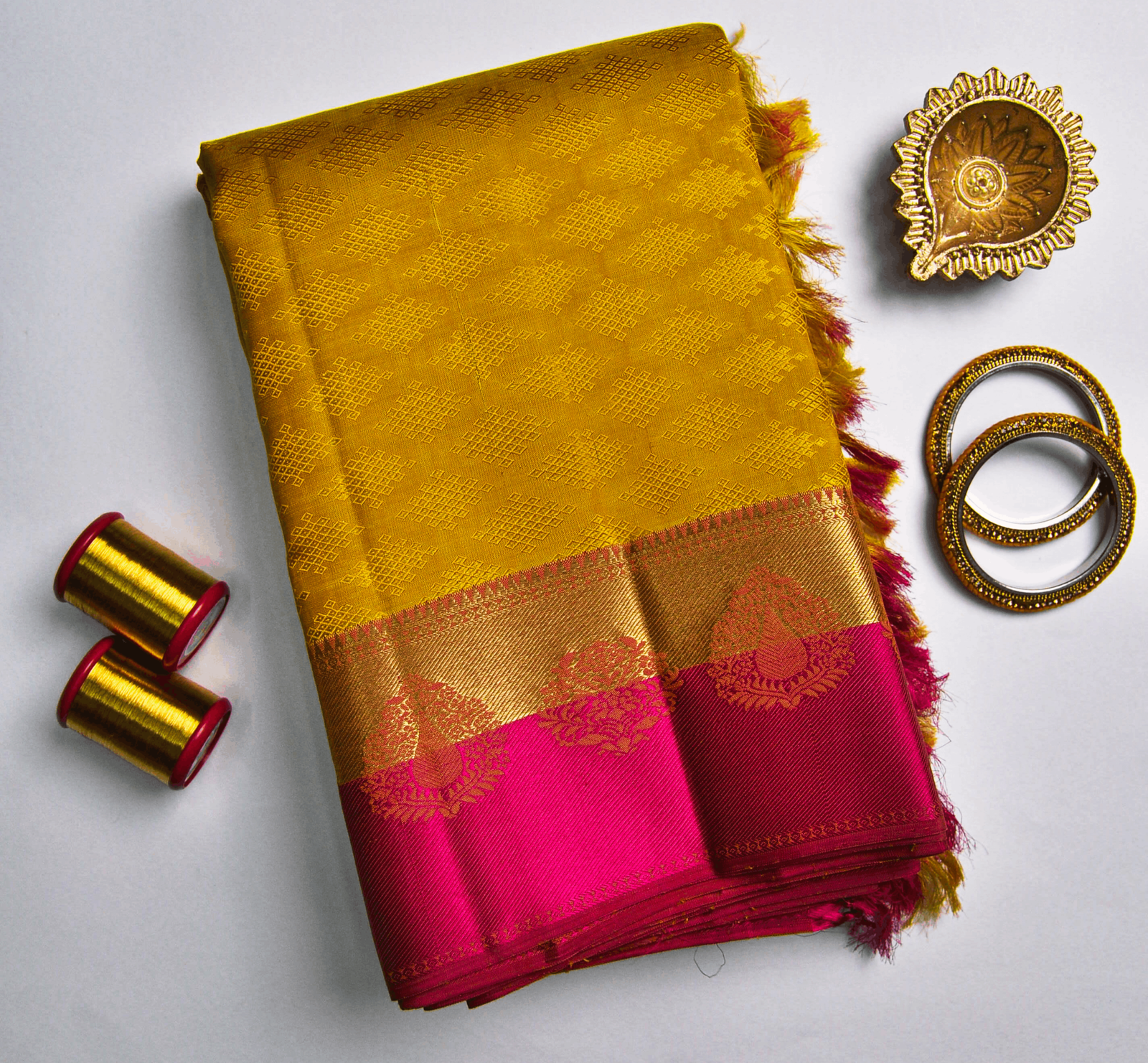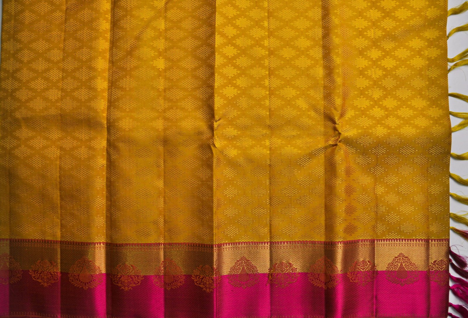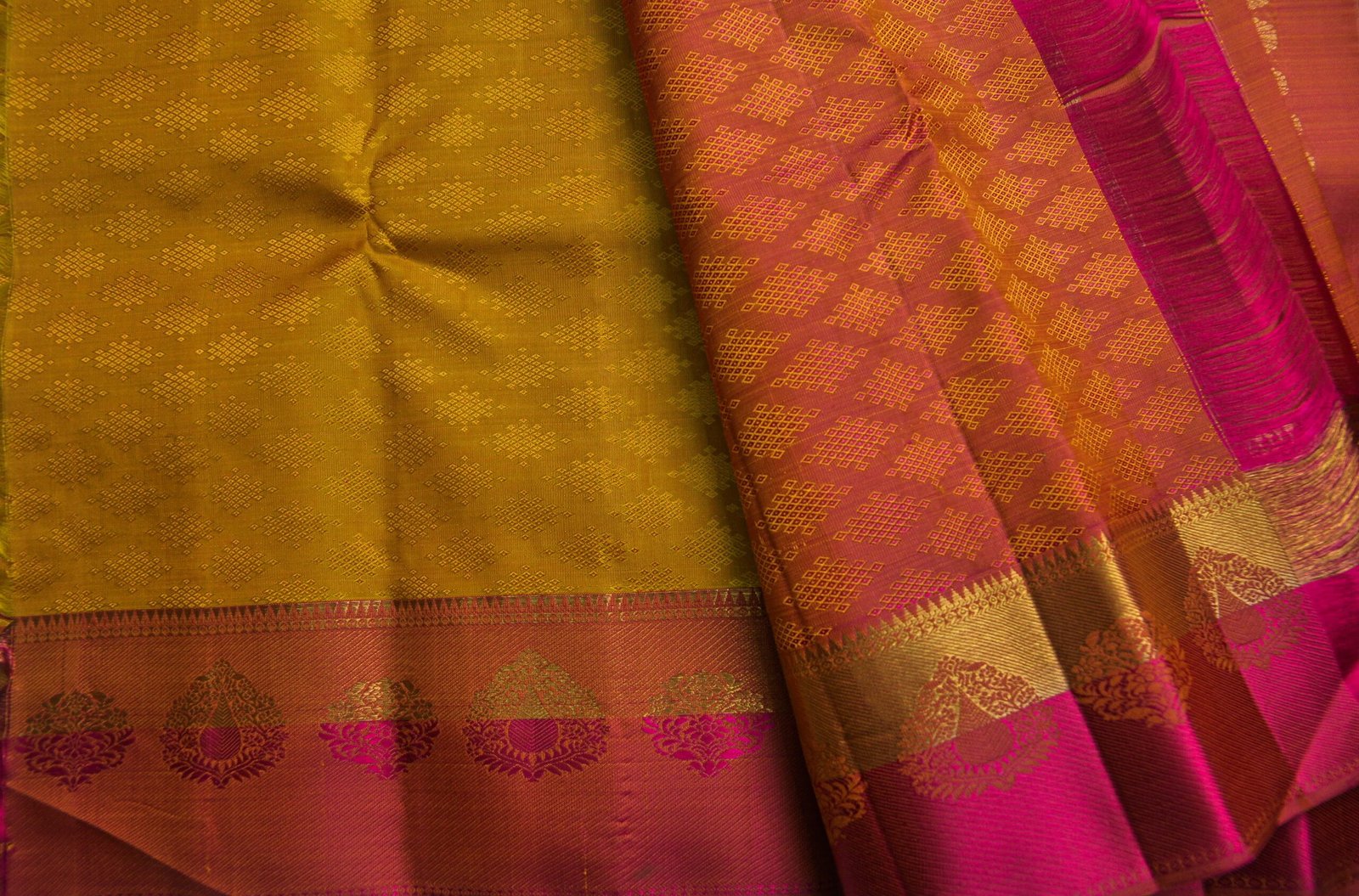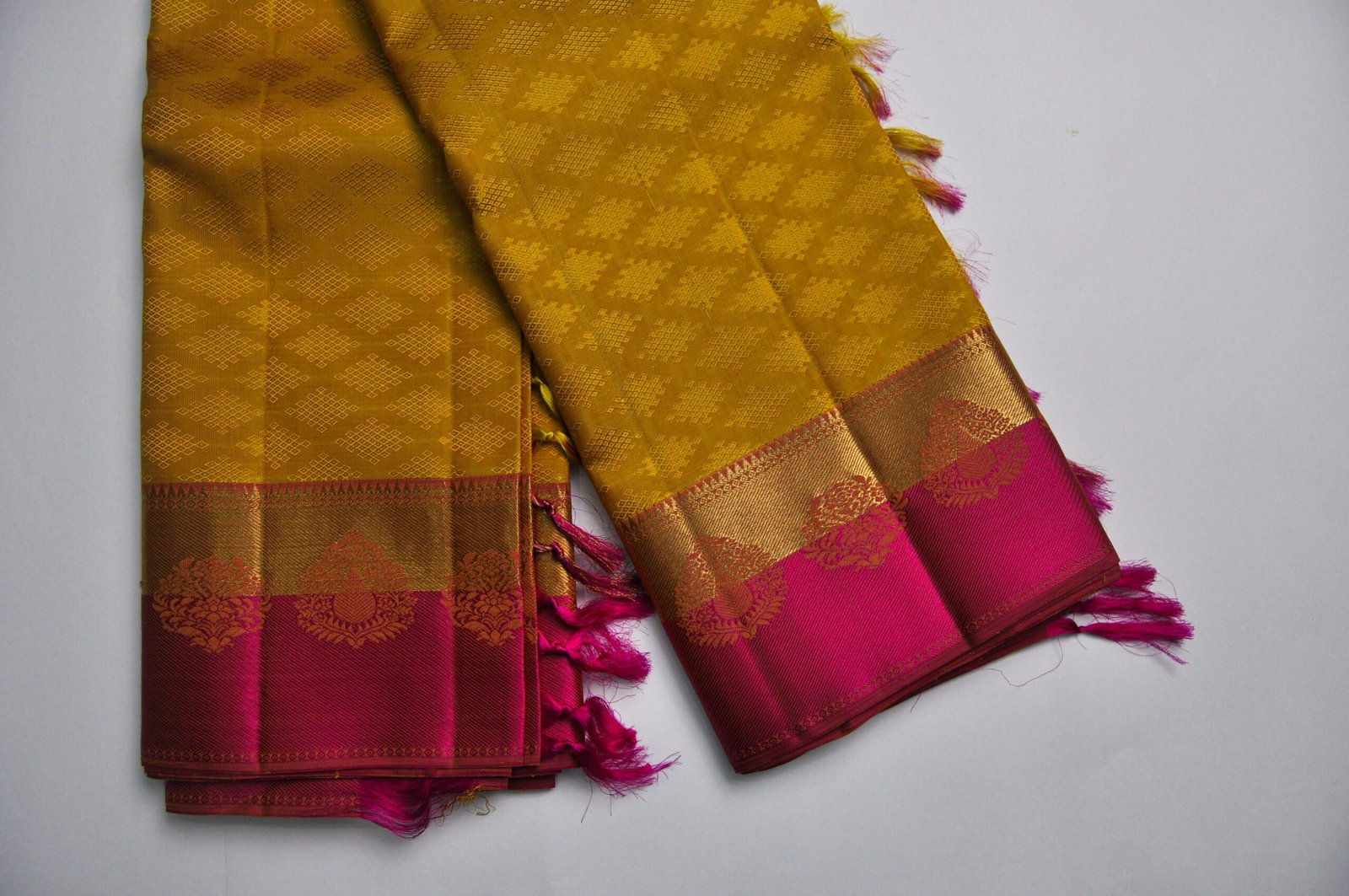 Mustard-dyed silk threads are notoriously difficult to fix in colour without affecting the weave structure. Skilled Kanchipuram dyers and weavers work together to ensure the thread maintains its hue through the weaving process — a collaboration that is part science, part tradition.