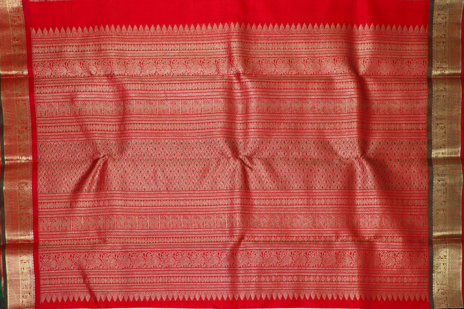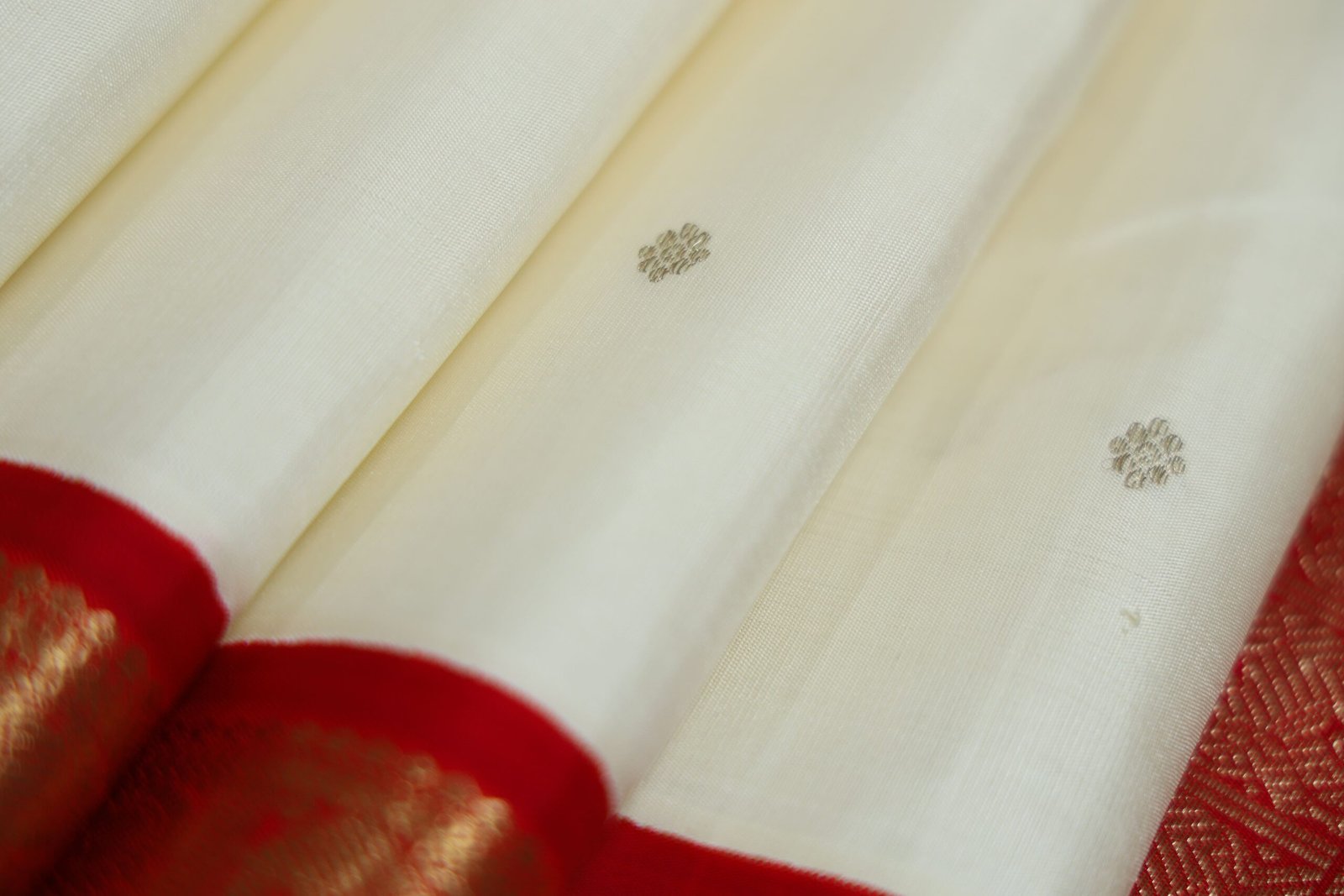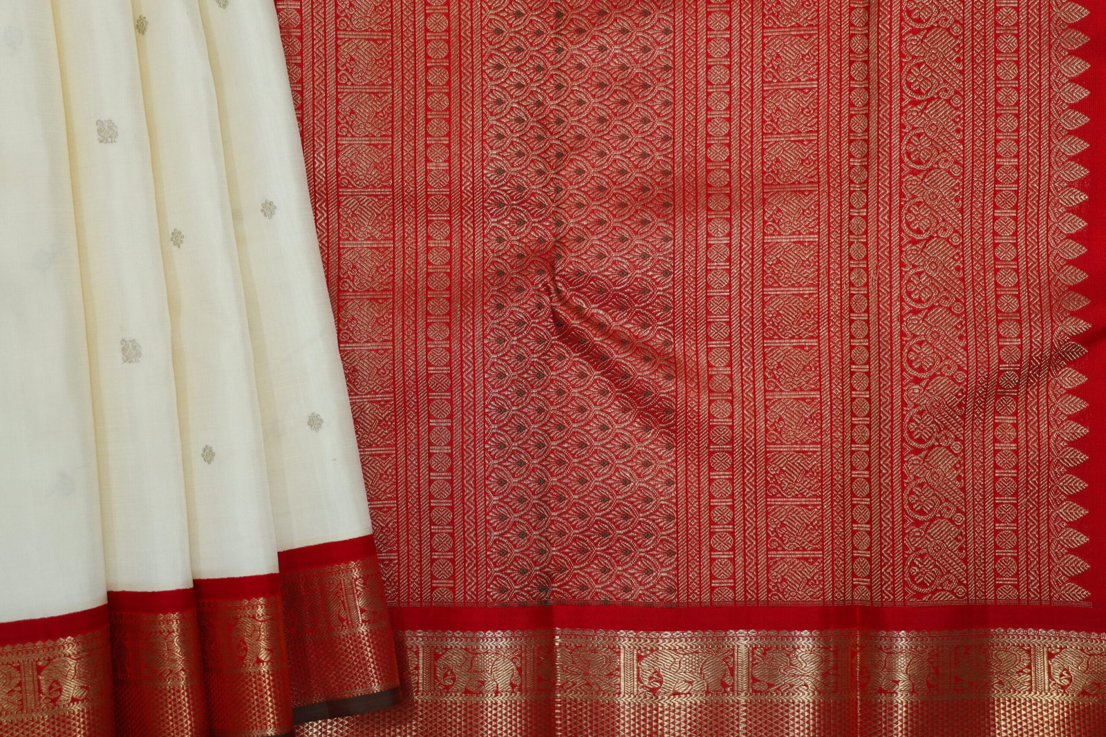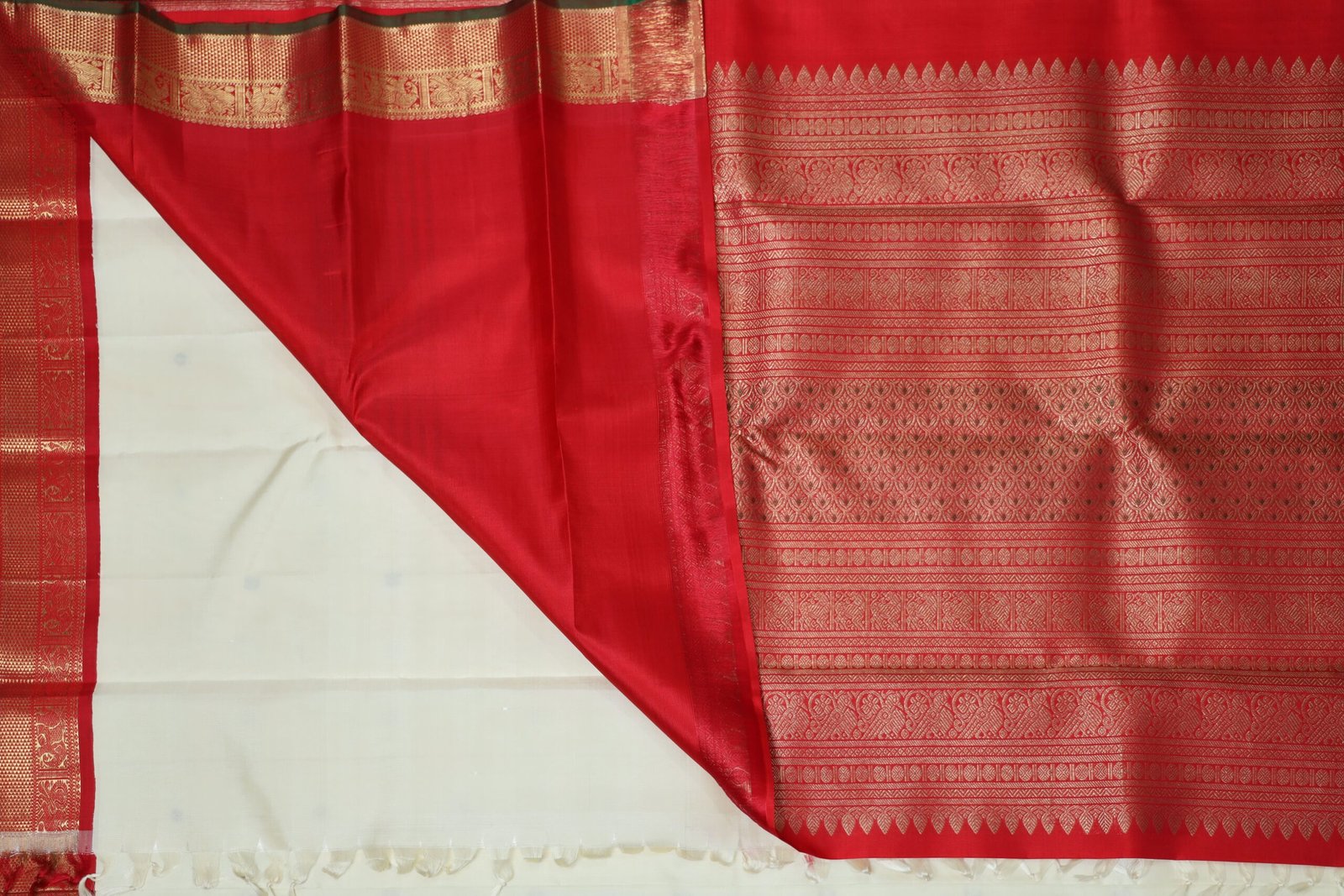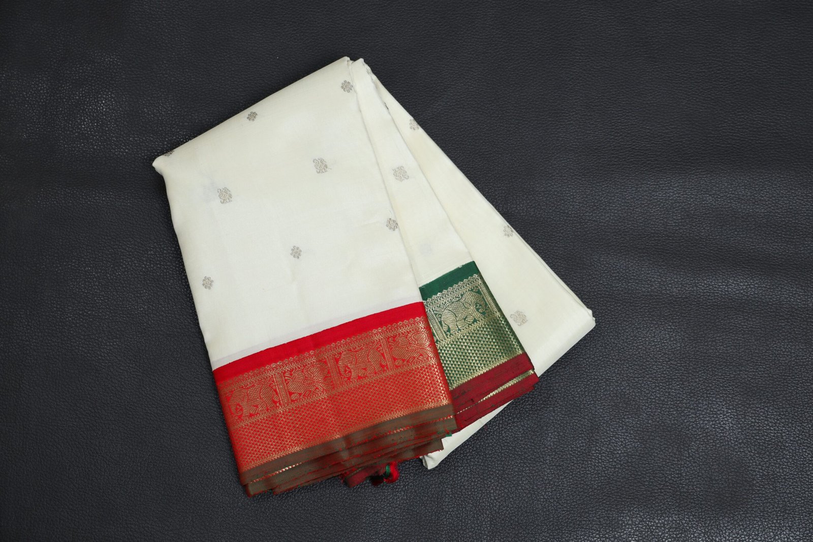 A D/S Kanchipuram silk saree in soft Off-White with the prestigious Ganga Jamuna border in green and red contrast, zari butta body work and grand pallu.